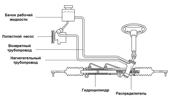 Насос, нагнетающий давление, запускается от электромотора или непосредственно двигателя. В результате масло попадает на рейку. При прямом положении колес рабочий раствор циркулирует “вхолостую”. При изменении положения спецраспределитель перезапускает масло, воздействуя на вал (к которому прикреплены рулевые тяги). В результате работа усилителя обеспечивает легкость поворота руля. Своевременная замена жидкости в узле позволяет продлить срок жизни запчастей, снижая нагрузку на них. В противном случае ресурс агрегата заметно снижается.